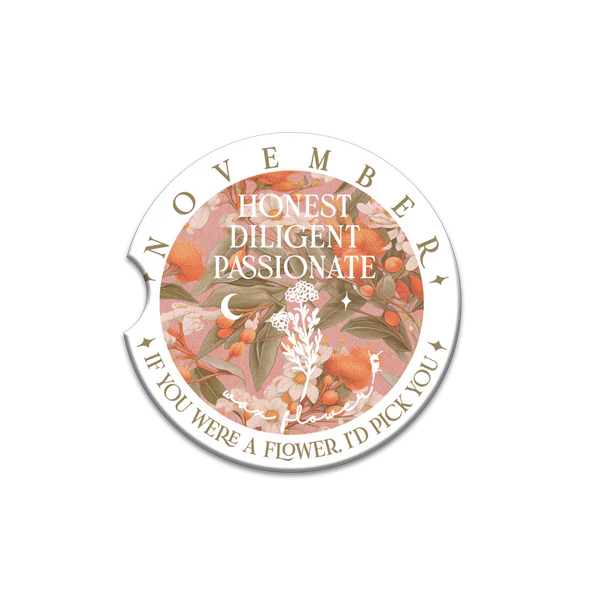 Keep your car cup holders clean and free from spills with this handy little beauty, made from ceramic that absorbs moisture. Each coaster has beautiful embossed printing & features a unique sentiment dedicated to your birth month.