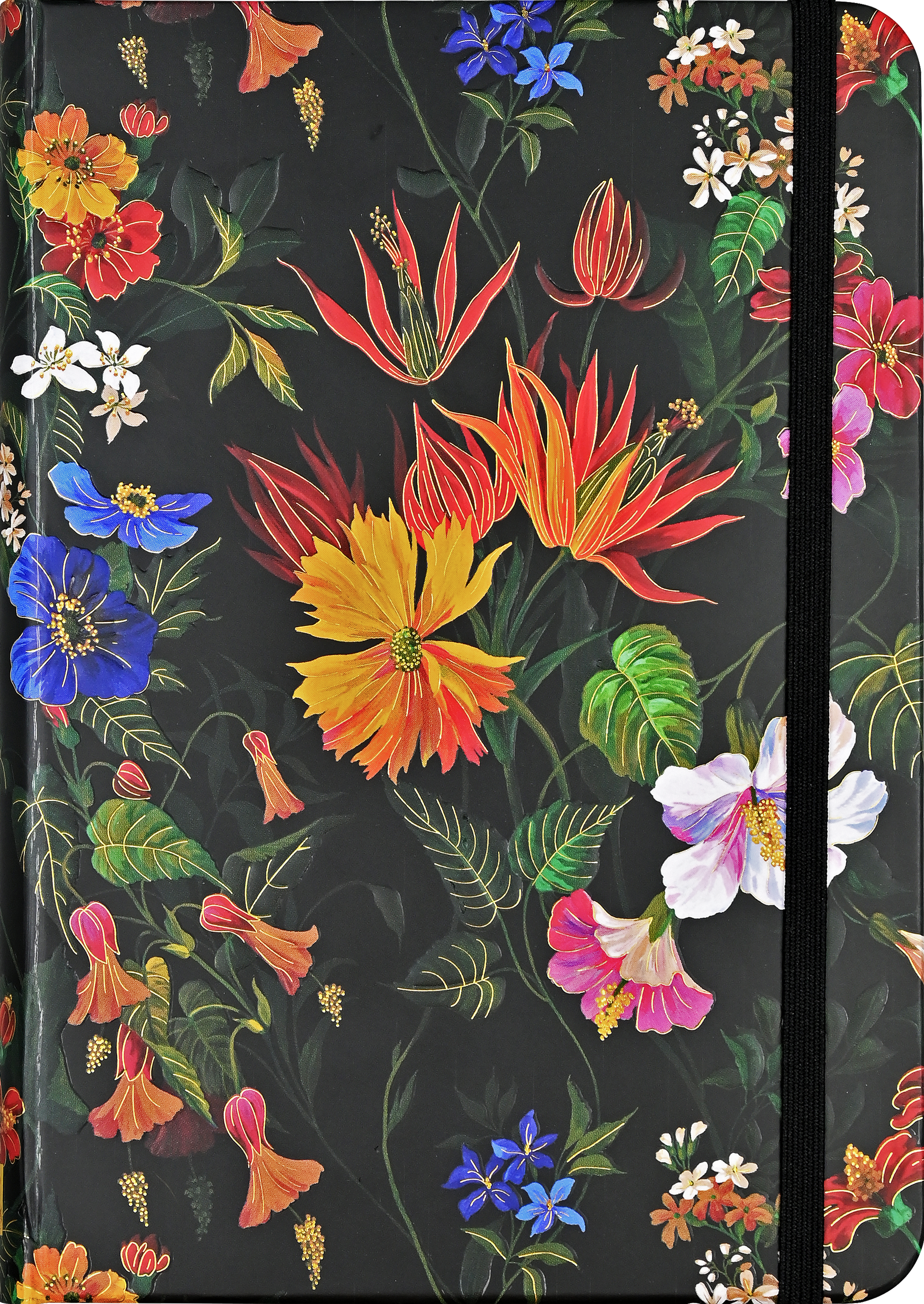 Stunning journal showcases fabulous florals brimming with dramatic color, set against a sleek black background. Inside, ample space is provided for personal reflection, sketching, or capturing favorite quotations or poems. Premium smooth-finish 120 gsm paper accepts pen or pencil beautifully. Light gray lines subtly guide your writing. Paper is acid-free and of archival quality, preserving your thoughts for years to come. Our cover design is embossed and embellished with hand-selected touches of gold foil. An added touch: The journal's page edges are gilded in gold foil. For practicality, you'll find an expandable pocket inside the back cover; it's the perfect place to tuck notes, mementos, and more. Use the matching elastic closure to secure your journal. Interior endsheets complement the overall design. Sturdy book bound-style binding ensures durability. Convenient small-format size, 5''