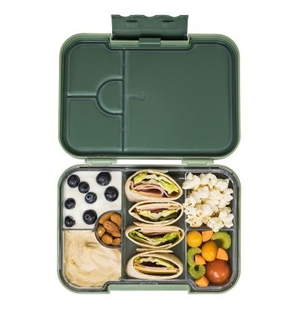 6 different compartments including a removable 4 compartment inner sandwich tray. Leak proof seals for packing wet and dry foods side-by-side. Tapered, take-apart design for a complete clean.