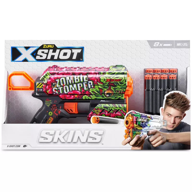 X-Shot Skins darts include new air pocket technology for a faster, further, and more accurate shot. The X-Shot Skins Flux blaster comes in 6 unique skins to select and collect, to build your ultimate armoury. Choose different, choose X-Shot Skins.
